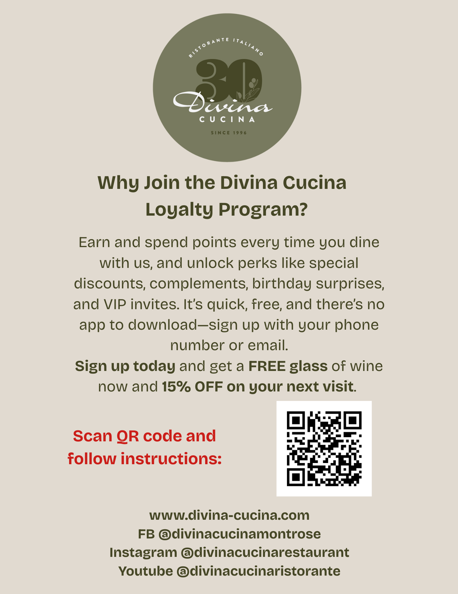 Elevate your dining experience at Divina Cucina by joining our exclusive loyalty program. Savor every bite of our authentic Italian cuisine—from handcrafted pasta to fresh seafood—and be rewarded with special offers, personalized invites, and priority reservations.