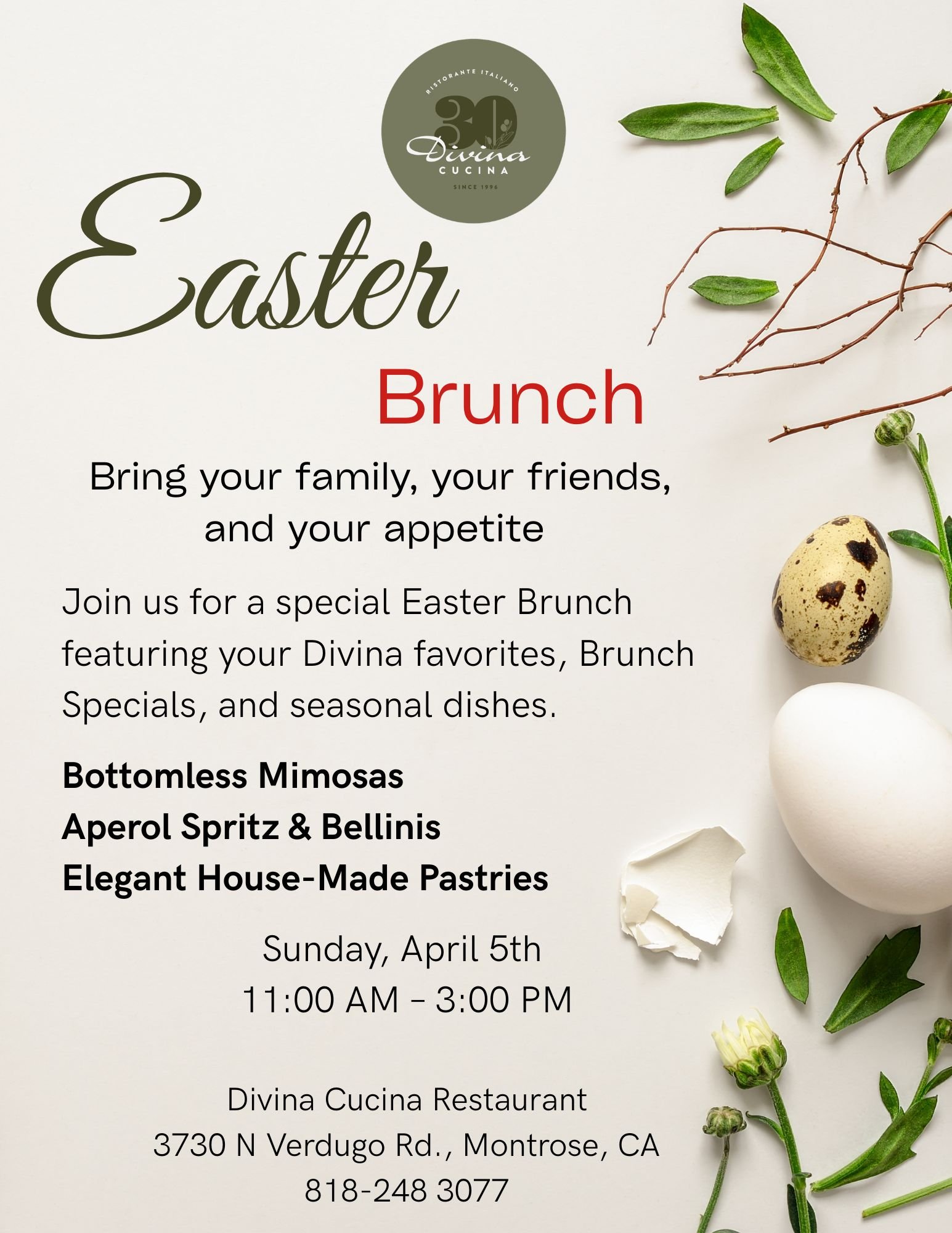 Join us for a special Easter Brunch featuring your Divina favorites, seasonal dishes, and a beautiful atmosphere.